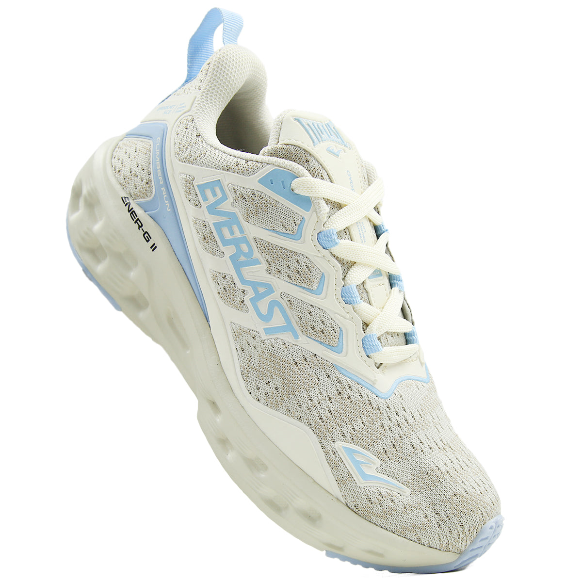 Everknit: Tecido tramado através de uma combinação de fios com áreas de maior abertura em pontos estratégicos para melhorar a respirabilidade do pé, fornecendo um calce ajustado e muito conforto.